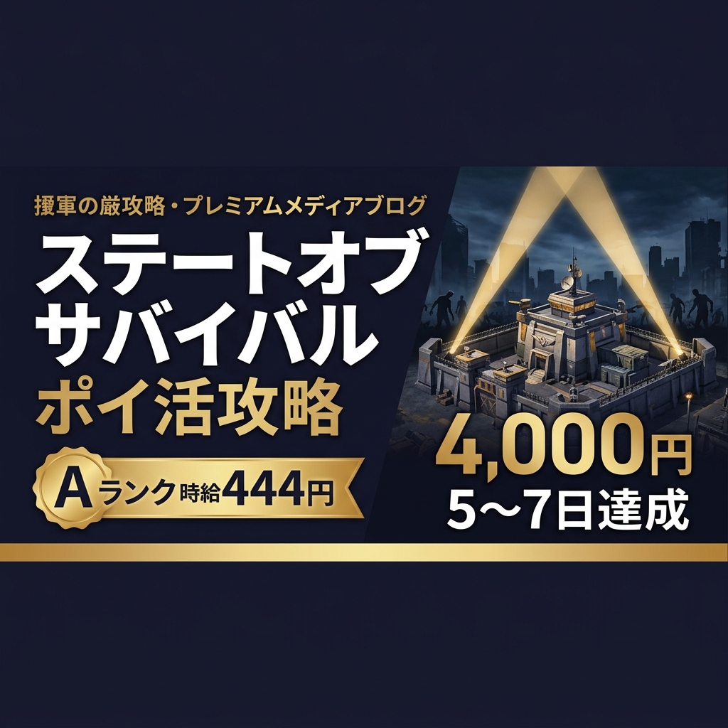 この記事を読めばわかること:ステートオブサバイバルを初めてインストールした方でも、5〜7日・約9時間でMoppyで最大4,000円を獲得できます。本拠地(HQ)を指定レベルにする方法を操作レベルで解説します。